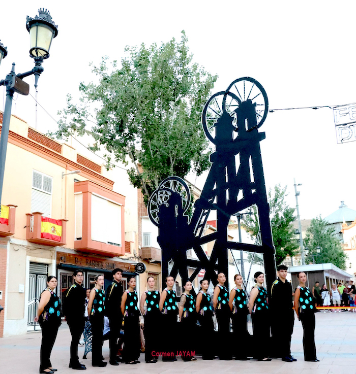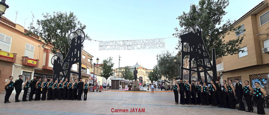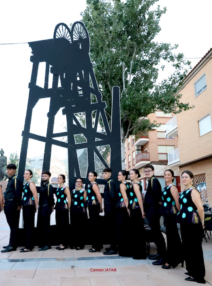 El grupos de azafatas de ambos sexos del 64 Festival del Cante de las Minas posa junto al pórtico de la 'Avenida del flamenco' con uno de los dos vestuarios que estrenarán en esta edición, los cuales han sido diseñados por José López, pintor almeriense afincado en La Unión. Las prendas están pintadas a mano.