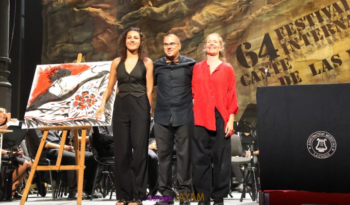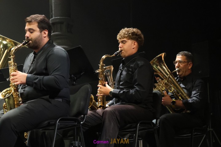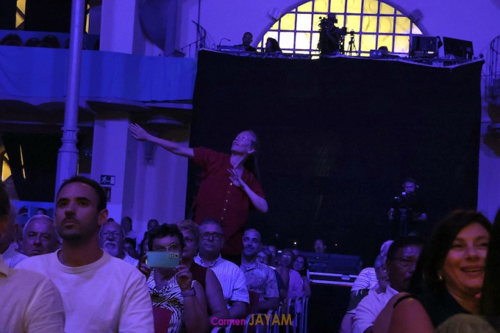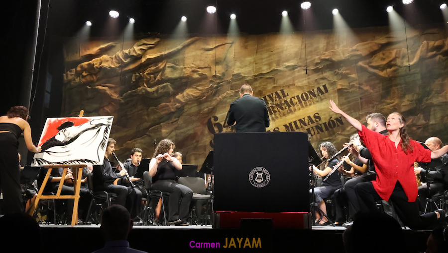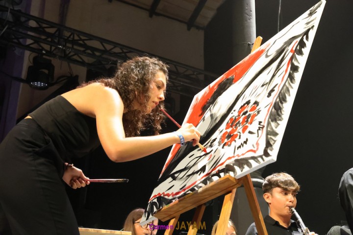 La Agrupación Musical de La Unión deleitó a los asistentes con cuatro piezas musicales, incluyendo pasodobles y una malagueña, guiados por su director Luis González Marín. Mientras las interpretaban, la artista Ana García, miembro de la banda, dibujaba una bailaora flamenca con un gran mantón en directo, entre canción y canción, y la bailarina Ilaria Orlandini hacía encajar el baile contemporáneo con los compases y ritmos de la agrupación.