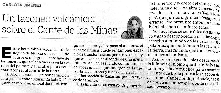 Así, recorro con los pies descalzos de la infancia el plomo que dio trabajo a mi familia y a la de muchos para escuchar el cante que brota junto a los vapores de las minas. Cante hondo, del suelo, capaz de construir un templo donde retenerlo cada verano".