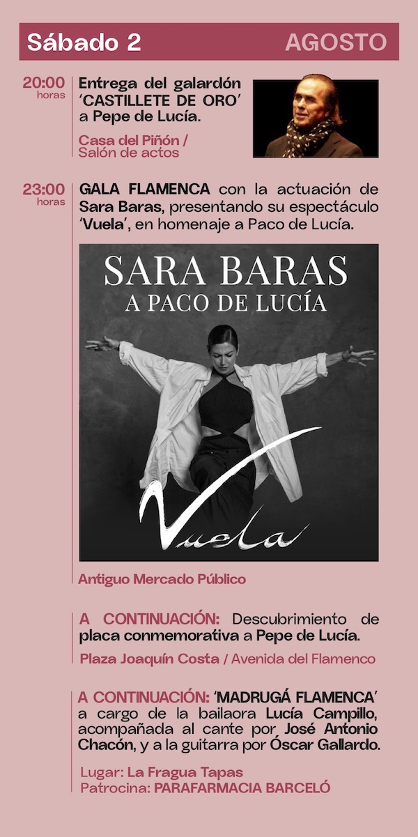 Paco de Lucía estará 'presente' esta jornada en el gran festival flamenco de La Unión, pues su hermano Pepe, también dilatado artista del arte jondo, recibirá el 'Castillete de oro' y descubrirá una placa en la 'Avenida del flamenco', para en la noche dedicar Sara Baras al gran y recordado guitarrista su espectáculo 'Vuela' en 'la Catedral', para el que se agotaron las entradas hace muchas fechas. Cerrará 'la madrugá' en La Fragua.
