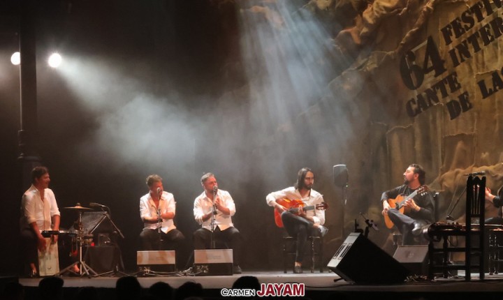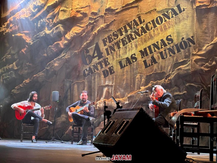 “Estoy tan emocionado que no puedo ni hablar, pero el corazón lo traigo hirviendo”, confesaba ante el público que anoche acudió a su gala del Festival Internacional del Cante de las Minas tras abrir el espectáculo con una taranta, solo, en un escenario en el que el dinamismo de su toque hizo dejarse llevar por el juego de intensidades que brindó desde la primera pieza. Fue tras esta primera interpretación cuando recordó su paso por el concurso de La Unión, especialmente al subir la rampa hacia el escenario. “Me he puesto ‘atacao’, como si fuera a concursar, pero al ver vuestro cariño me he puesto muy feliz y quiero que lo paséis bonito”, compartió, voceando un contundente “¡Viva La Unión!” que el público correspondió con aplausos; los primeros de muchos que le esperaban esa noche.
