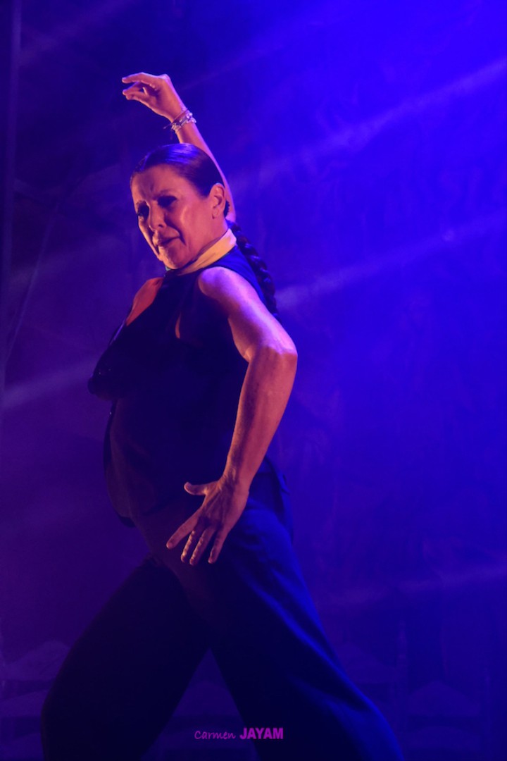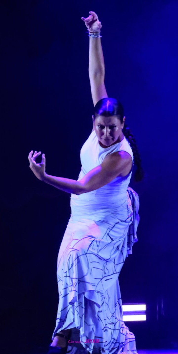 La presencia de Sara Baras en el escenario hace que no se necesite nada más para transmitir la verdad de su arte. Tiene esa capacidad de simular un corazón que late con el pulso de sus pies, sobrecogiendo a quien la ve en su propio vuelo encima del escenario. A pesar de que ‘Vuela’ lleva más de 127 funciones y que la artista ha estado presente en diferentes países, minutos antes de volver a ese escenario afirmaba estar aún más nerviosa que el primer día. “Estoy súper contenta de estar aquí, pero nerviosa por la responsabilidad de volver a un festival tan importante y que quiero tanto, y que, encima, me ha mostrado siempre su cariño y me ha visto crecer”, afirmaba, recordando que fue en el 1997 cuando vino por primera vez, así como su nombre en la ‘Avenida del Flamenco’ o su ‘Castillete de Oro’ en 2012. Pero fue pisar ese conocido escenario y Sara volvió a sentirse como en casa.
