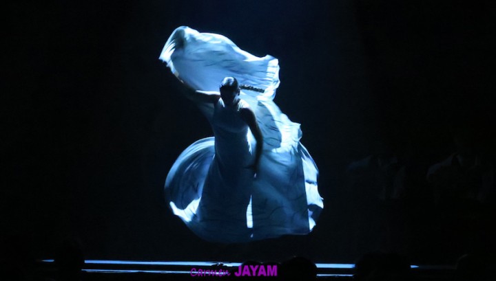 Durante todo el espectáculo, el baile entre Sara Baras y la penumbra fue una constante. También los silencios, reflexivos y expresivos a través de sus manos y el movimiento de su cuerpo. Como el momento en el que parece haber depositado una flor en la tumba del guitarrista de Algeciras, como una ofrenda, cuyo dramatismo se plasmaría en una saeta en la que sus taconeos retumbaban como el sonido de un tambor. En todo momento Paco de Lucía parece estar presente, a su lado.