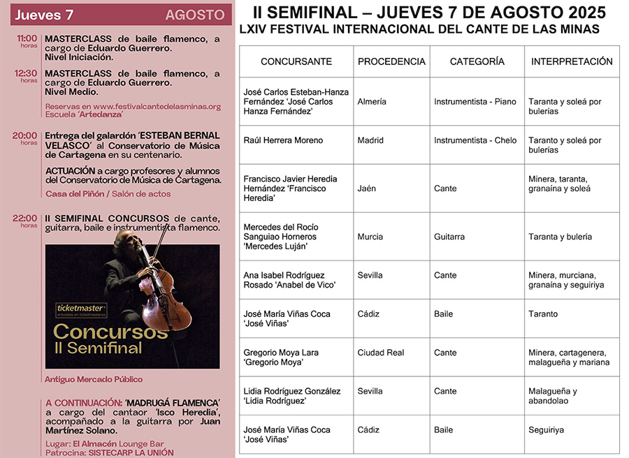 Ya en la ‘Catedral del Cante’, a las 22:00 horas, tendrá lugar la segunda seminfinal del concurso del Cante de las Minas. En ella participarán José Carlos Esteban-Hanza Fernández ‘José Carlos Hanza Fernández’ (Almería) con su piano por taranta y soleá por bulerías, y Raúl Herrera Moreno (Madrid) con el chelo con taranto y soleá por bulerías, en la categoría de instrumentista.