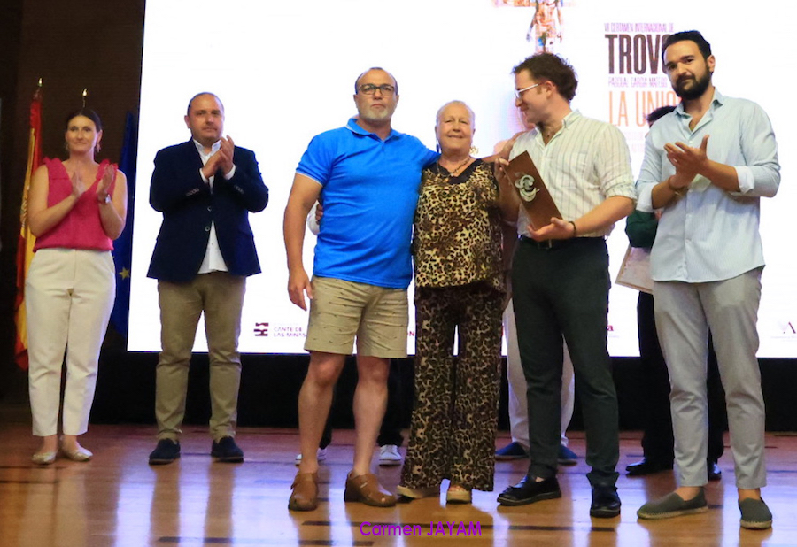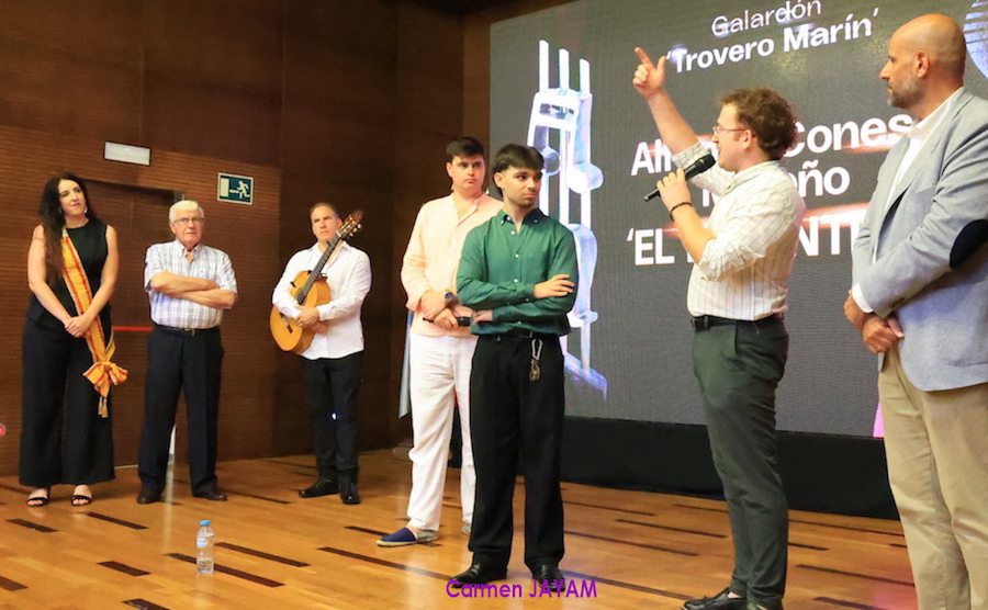 Otro momento para recordar fue cuando el alcalde y presidente de la Fundación del Cante de las Minas, Joaquín Zapata, fue a entregar el premio 'Ángel Cegarra-Conejo II' al vencedor, Juan Diego Celdrán, proponiendo entonces a su nuera, Sara, quien se encontraba entre el público, que protagonizase la entrega. Subió acompañada de Juan Manuel Cegarra Pedreño, nieto del recordado trovero que nos dejó hace quince años, quien también ofreció un fugaz y emotivo trovo.