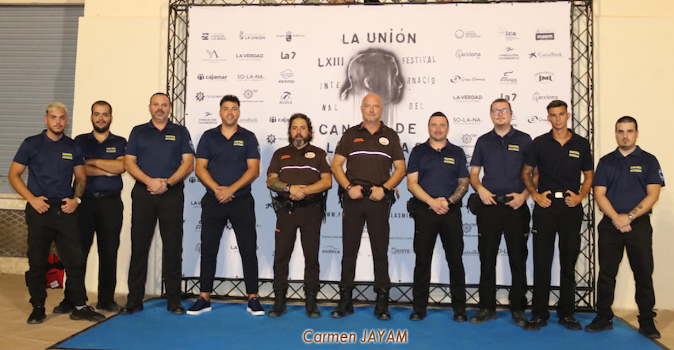 El equipo que se encarga de la vigilancia privada de 'la Catedral del Cante de las Minas' posando en el photocall ubicado en un lateral de la entrada, que es novedad este año.