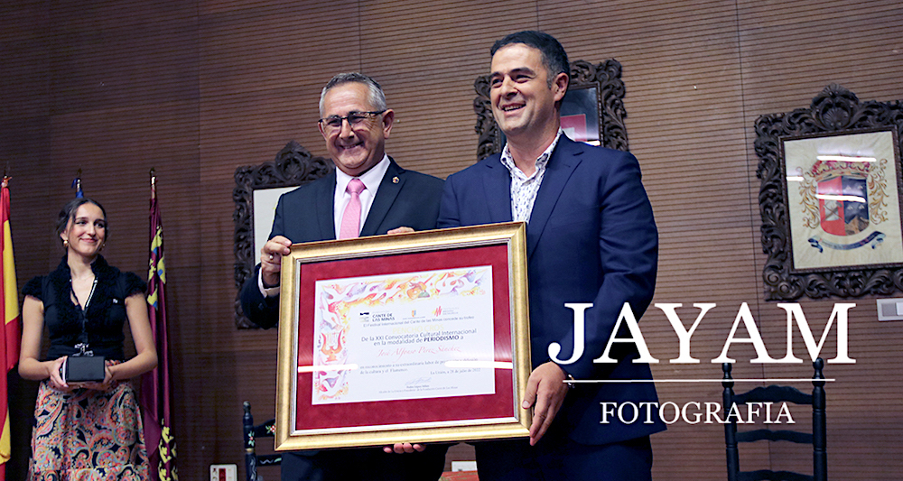 El periodista unionense y director del Centro Territorial de RTVE en la Región de Murcia ha recogido el premio de manos del alcalde, Pedro López Milán, quien ha estado acompañado por el presidente del ente público televisivo, José Manuel Pérez Tornero, que es el pregonero de esta 61 edición del Festival del Cante de las Minas.