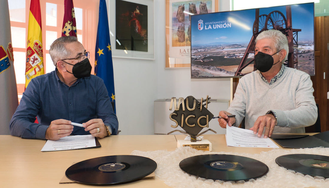 El presidente del Consejo Comarcal de El Bierzo, Gerardo Álvarez, y la primera teniente de alcalde del Ayuntamiento de La Unión, Elena Lozano, han firmado el contrato que consolida la hermandad de las dos cuentas mineras en torno al flamenco.