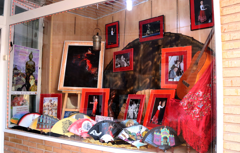 El establecimiento de fotografía de la calle Mayor ha vestido sus escaparates con fotografías y símbolos flamencos, estando enriquecido con el trofeo ‘Desplante’ para la categoría masculina.