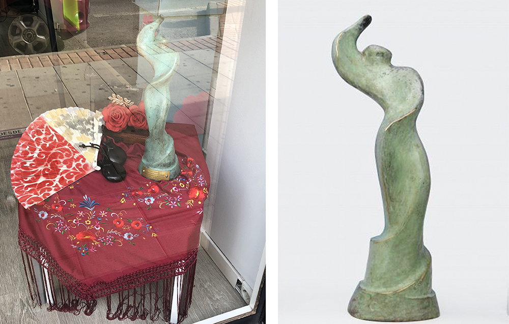 El establecimiento de telefonía móvil muestra en su escaparate el trofeo ‘Desplante’ que recibirá la mejor bailadora del gran certamen flamenco de La Unión. Este galardón se estrenó en el año 2019, siendo Olga Llorente la primera artista que lo conquistó.