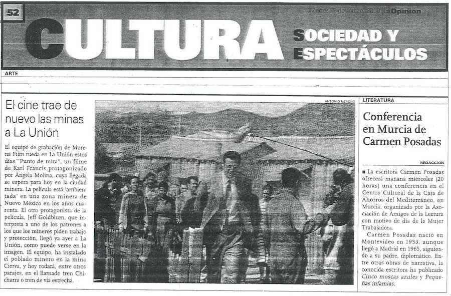 Antonio Gómez Pérez rescata una fotografía del rodaje de la película 'Punto de mira', basada en 'La sal de la tierra' en Portmán en marzo del año 2000. Antonio Meroño, por su parte, aporta el recorte de la publicación de La Opinión de entonces.