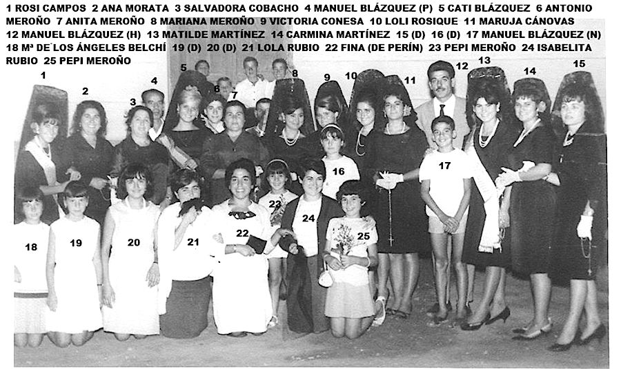 De pie: Ginés Cabezos, Carmelo Fernández Aguilera, Luis, Tomás Jiménez, Fina Pérez Llamusí, Mateo, Paco Saura, Maruja Cánovas, Ginés Hernández 'Ginesito' y Marcos Hernández.
