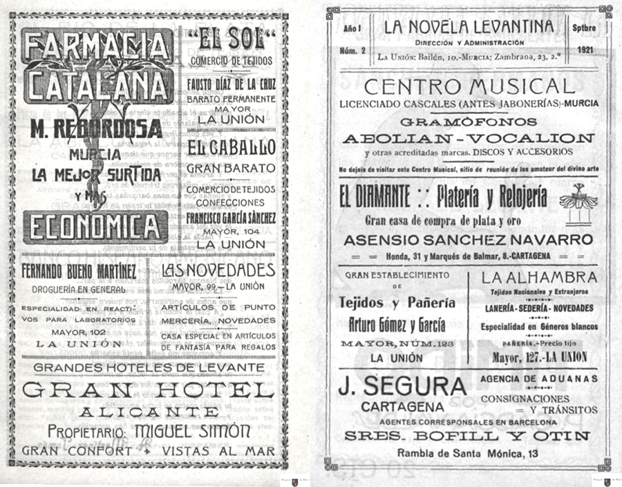 El mapa del comercio de La Unión ha cambiado casi totalmente en un siglo. Así lo podemos comprobar viendo los dos primeros números de ‘La novela levantina’, una publicación surgida en esta tierra en 1921, que tenía anuncios especialmente relacionados con tejidos y confecciones. Muchas de estas marcas ya no existen, salvo en casos como ‘Las novedades’.