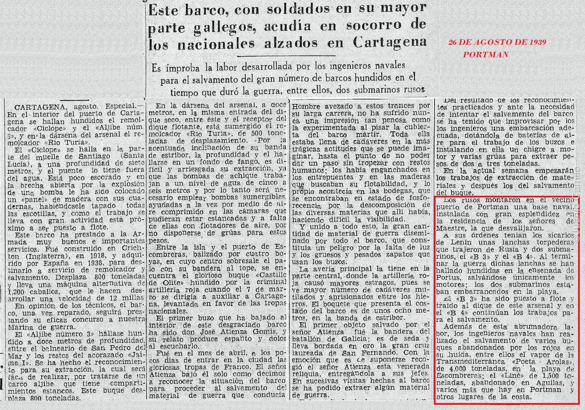 El periódico de 26 de agosto de 1939, escasas semanas después de terminar la Guerra Civil española, recogía que estaba instalada "con gran esplendidez en la residencia de los señores de Maestre, la que desvalijaron (...) Tenía lanchas torpederas que trajeron de Rusia y dos submarinos (B3 y B4). Al terminar la guerra, las lanchas quedaron hundidas en la ensenada de El Portús (...) los dos submarinos estaban embarrancados en la playa. El B3 ha sido puesto a flote y traído al dique del Arsenal de Cartagena y en el B4 continúan los trabajos para el salvamento ...".