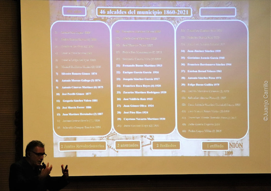 El cronista actual siguió ofreciendo, de forma ágil, más datos muy interesantes, como que tres alcaldes de La Unión sufrieron atentados, que dos fueron fusilados en la Guerra Civil y que uno se exilió. Fue Antonio Laliga Andújar el que gestionó el cambio de nombre del municipio a La Unión, Miguel Zapata auspició el primer teléfono en el municipio en 1884... Hay mucho más, como las obras que llevaron a cabo los distintos regidores del municipio y otros logros, por lo que merece la pena escuchar íntegro el vídeo adjunto.