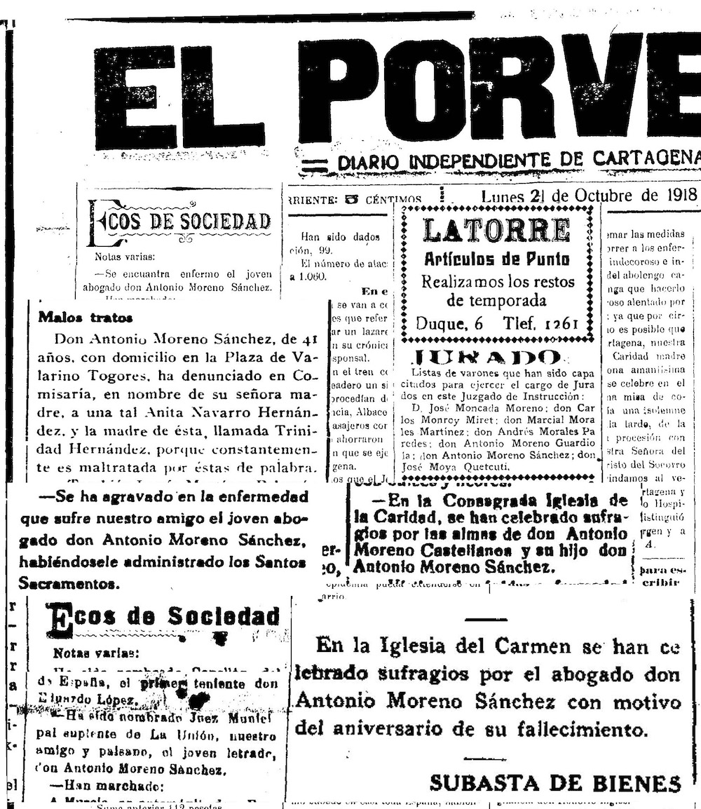El librito tiene en el Lomo, el título “Ortografía” y en la parte de abajo las iniciales de AMS, y aquí entra el personaje de Antonio Moreno Sánchez, al que perteneció este tratado, y que fue nombrado Juez Municipal suplente de La Unión en 1917. En 1918 cae enfermo. Como anécdota, puso denuncia en 1931 por insultos de unas personas (Ya entonces por insultar también se denunciaba). Posteriormente, en febrero de 1932, se le agrava una enfermedad que padecía y se le administraron los Santos Sacramentos, falleciendo en ese mismo año, publicándose el 3/03/1933 “En la iglesia del Carmen se han celebrado sufragios por el abogado don Antonio Moreno Sánchez con motivo del Aniversario de su fallecimiento”, no obstante, en 1934 aún aparecía en las listas de varones que habían sido capacitados para ejercer el cargo de Jurados en el Juzgado de Instrucción. Ya fallecido, en junio de 1942, en Cartagena, en la Iglesia de La Caridad, se vuelven a celebrar los sufragios por las almas de su padre y de él.