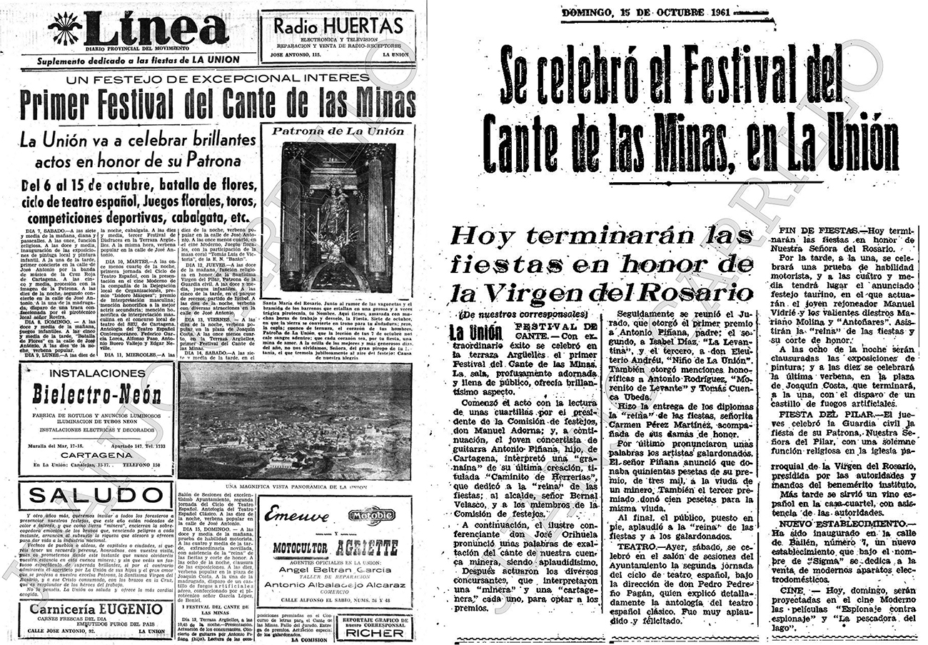 ...13 de octubre, pero de 1961 y también viernes, se celebró la primera edición del Festival del Cante de las Minas dentro de las Fiestas del Rosario, siendo el marco el escenario de la Terraza Agüelles. También tuvo un arranque solidario, pues dos de los premiados destinaron parte del dinero ganado a una viuda de un minero.