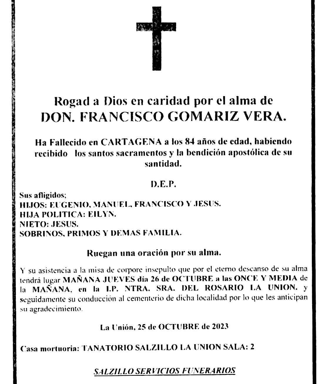 Paco Gomariz falleció hace unos días. Se trata de una persona que contribuyó de forma importante con La Unión en diversos terrenos, pues fue procesionista, caballero de Santa Bárbara y directivo del club de fútbol, entre otras facetas. Incluso, llegó a ser concejal, teniente de alcalde y, en funciones, alcalde.