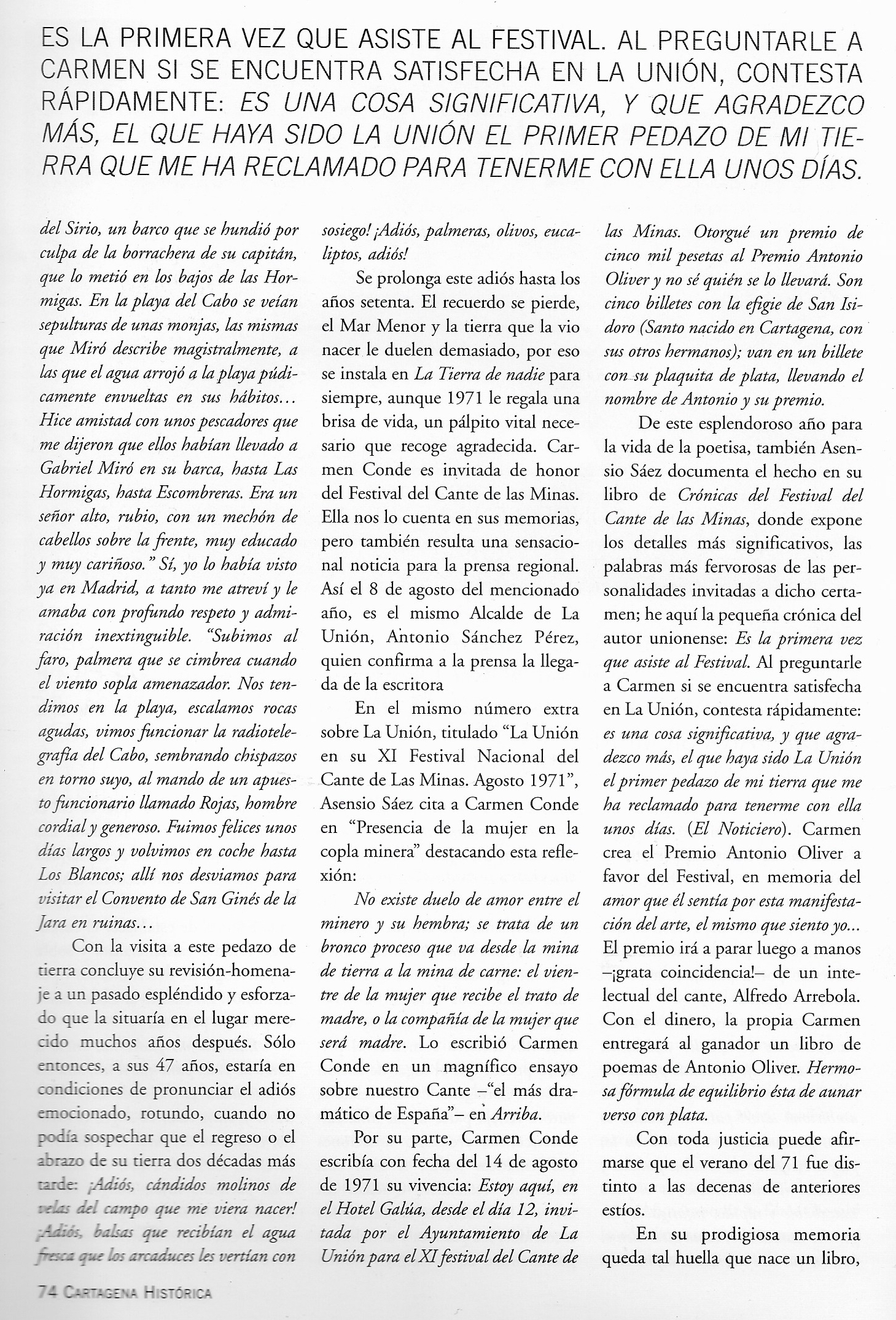 Carmen Conde fue nombrada 'Hija adoptiva de La Unión' en 1978, imagen obtenida de un ejemplar de 'Cartagena histórica' en la que que figura un artículo sobre la escritora en el que también se hace referencia a su primera presencia en el XI Festival del Cante de las Minas (fue en 1971), agradeciendo la invitación que le efectuó el gobierno local, cuyo alcalde era Antonio Sánchez Pérez. "Agradezco que haya sido La Unión el primer pedazo de mi tierra que me ha reclamado para tenerme con ella unos días", indicó la primera mujer académica en la historia de la RAE.