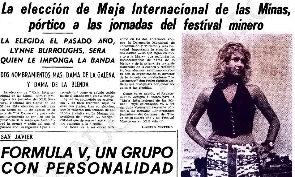 Juanjo Carrillo ('la-union-ciudad-del-cante-y-minera.es') ha descubierto que en los años setenta del siglo XX se efectuaba la elección de la 'Maja internacional de las minas' y de sus damas 'de la blenda y de la galena'. Las elegidas eran después el destino de trovos del 'Festival del Cante de las Minas'. La foto muestra un artículo firmado por el recordado Pascual García Mateos en el periódico 'La Verdad' anunciando la elección de 1973 y con foto de la maja de 1972, una joven británica.