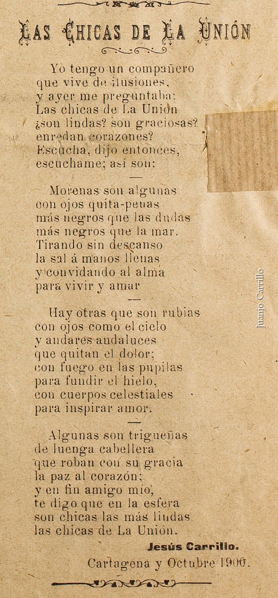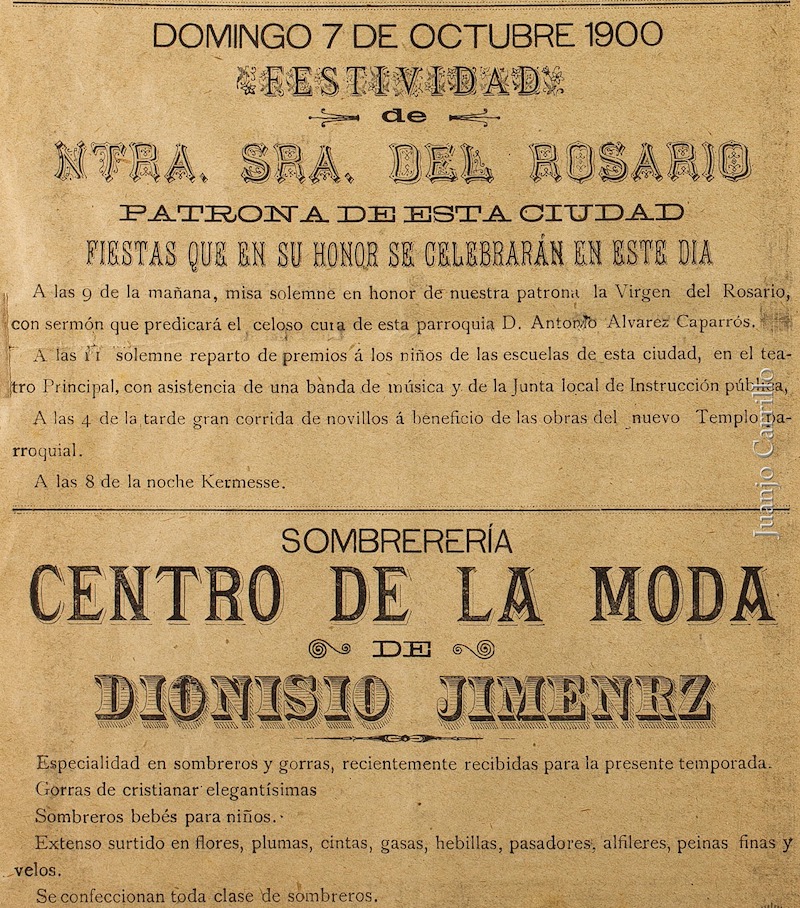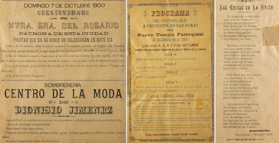 Juanjo Carrillo ('la-union-ciudad-del-cante-y-minera.es') rescata del año 1900 la celebración de la patrona, la Virgen del Rosario, con cuatro días de espectáculos (bailes, concierto y zarzuela) en 'el circo' siendo el precio de la entrada un real, moneda que ya no se utiliza y que figuró en el sistema monetario español entre los siglos XIV y XX. El dinero recaudado tenía como destino las obras del nuevo templo parroquial, al igual que el que se recogió de una novillada. También incluye un artículo escrito en octubre de aquel año por Jesús Carrillo dedicado a 'Las chicas de La Unión'.