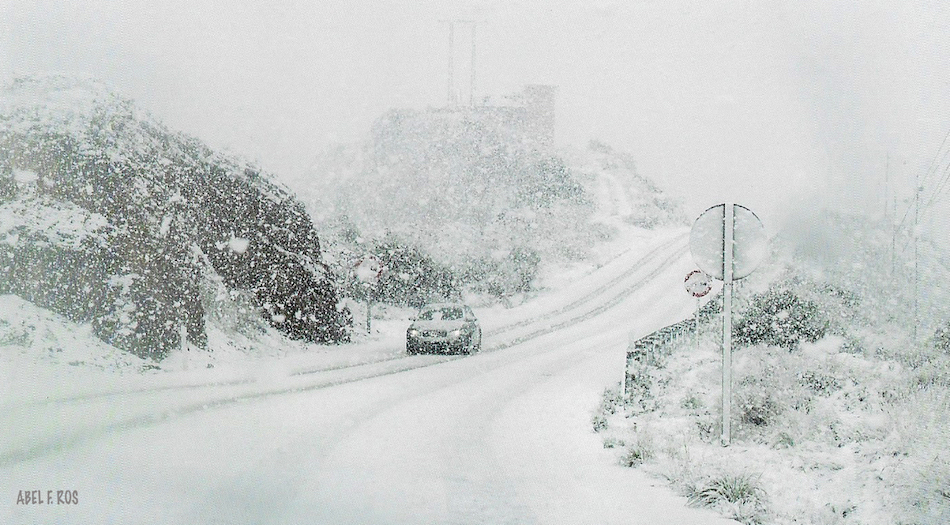 Tal día como hoy de hace ocho años tuvo lugar en nuestro municipio una nevada dentro de una ola de frío que se daba en la Región de Murcia. En la foto de Abel F. Ros se observa a un turismo circular por la carretera entre La Unión y Portmán aquel 18 de enero de 2017.
