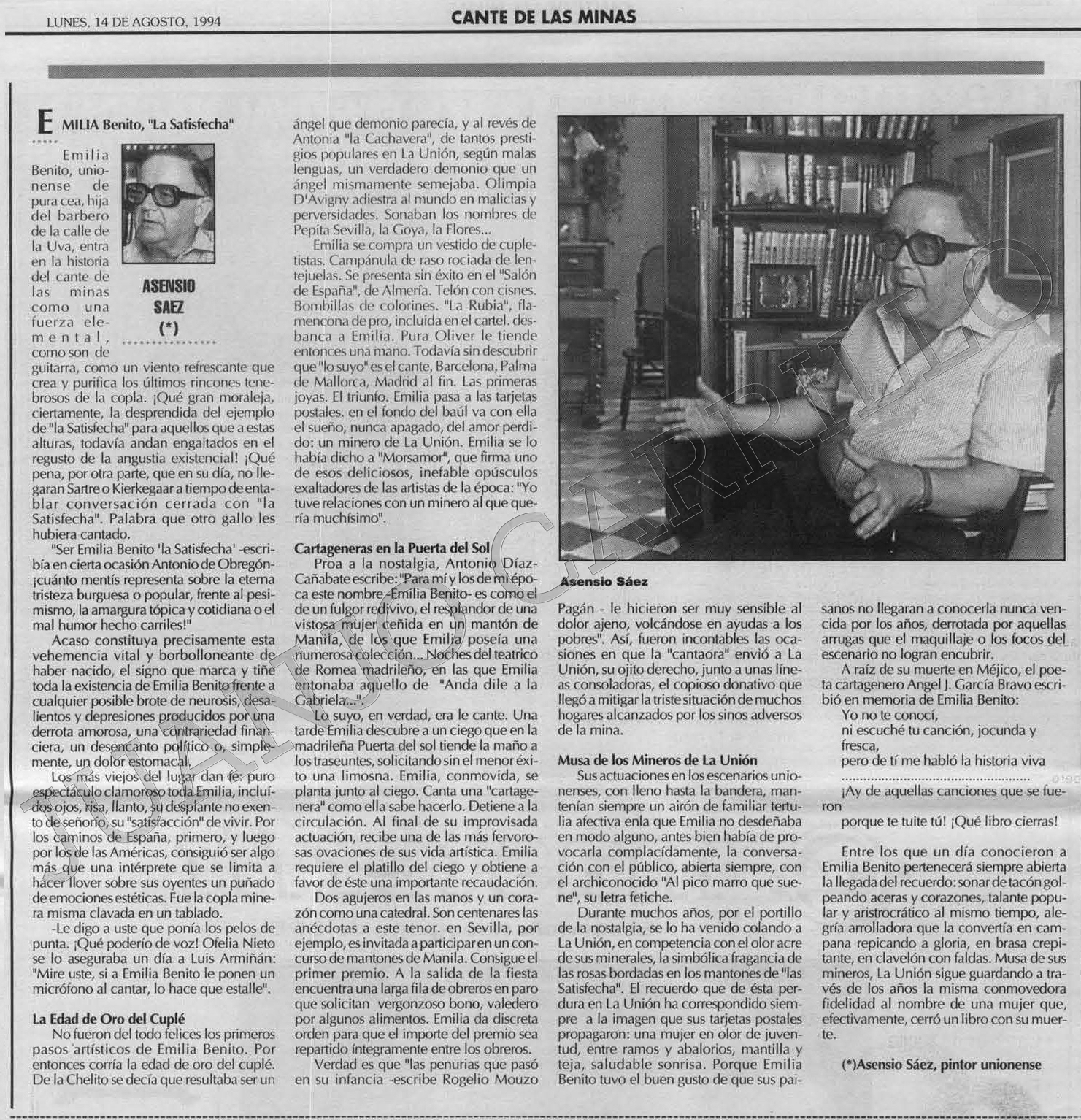 Juanjo Carrillo ('la-union-ciudad-del-cante-y-minera.es') publica un artículo dedicado a Emilia Benito, una unionense nacida en 1886 y con una calle a su nombre en nuestra ciudad, quien fue una de las más famosas artistas de su época interpretando copla, cuplé, flamenco y cantos regionales por toda España. En él incluye un artículo que le dedica el gran pintor unionense en la prensa regional.