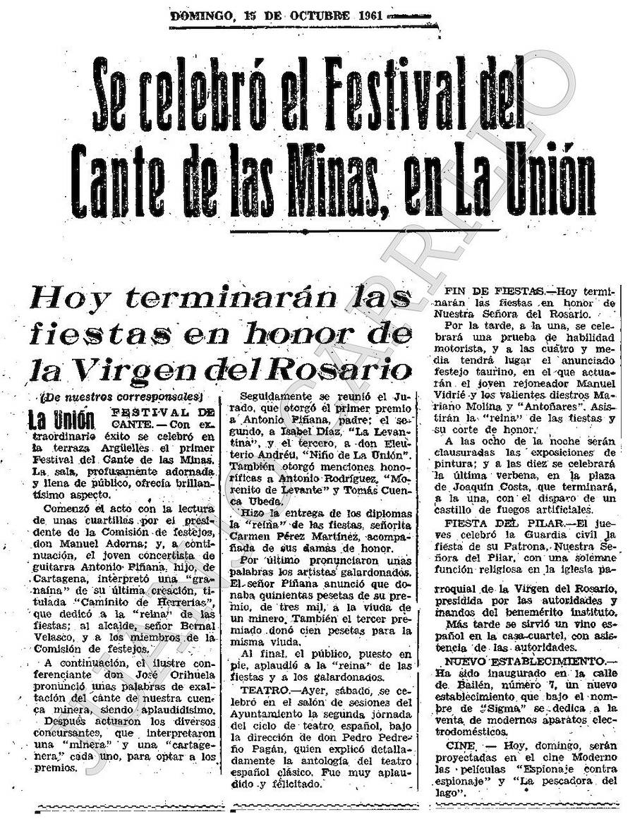 ... aquella edición de estreno comenzó con unas palabras de Manuel Adorna, presidente de la comisión de festejos, para, a continuación, el joven guitarrista Antonio Piñana ofrecer una 'granaína', la cual dedicó a la reina de las fiestas, Carmen Pérez Martínez; al alcalde Esteban Bernal Velasco, y a los integrantes de la comisión festera. El siguiente capítulo fueron una palabras de exaltación del cante ofrecidas por José Orihuela, que fueron "aplaudidísimas", según se recoge en una de las crónicas. Después actuaron los concursantes, quienes interpretaron una 'minera' y una 'cartagenera'. Se puede ampliar la información leyendo el texto del artículo publicado el domingo 15 de octubre de 1961.