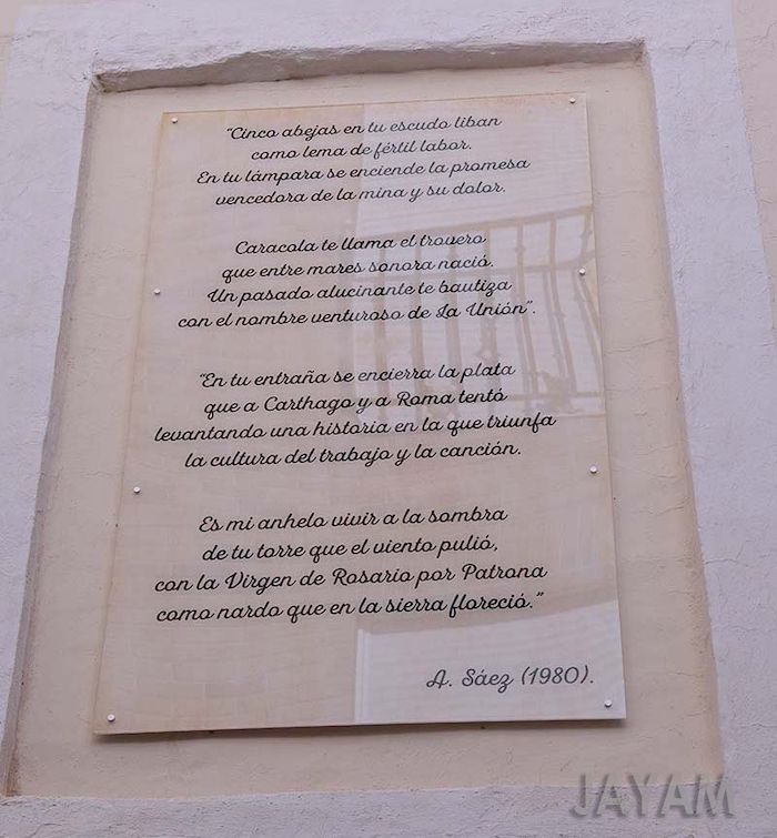 En esta pared hay una placa de metacrilato con cuatro estrofas celebres dentro de su extensa obra, incluyendo la primera del himno de La Unión, obra de Asensio Sáez.