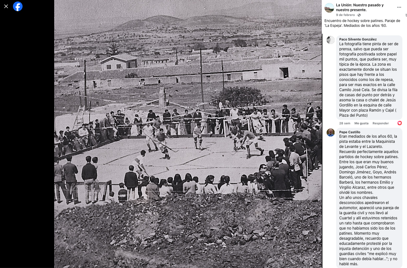 Encontramos en el perfil de Facebook 'La Unión: Nuestro pasado y nuestro presente' una fotografía de mediados de los años sesenta del siglo XX de un partido de hockey sobre patines disputado en el paraje 'La Espeja', en una pista que estaba entre La Maquinista de Levante y el Lazareto. Pepe Castillo, cronista taurino y quien era uno de los jugadores, recuerda algunos nombres de aquellos deportistas del 'stick' (palo para el juego).