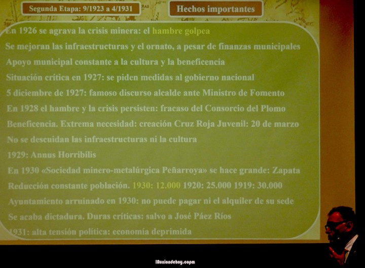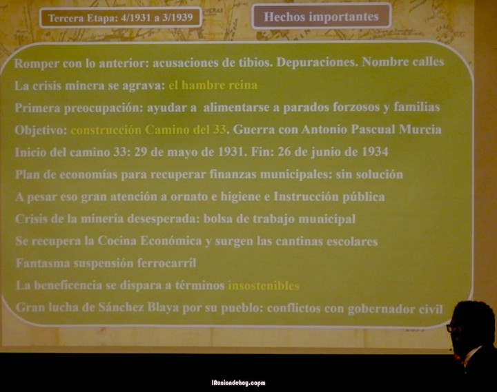 Vamos a la tercera etapa, centrada en la II República y en la Guerra Civil, la cual 'se chupó' como alcalde Francisco Alcaraz, quien era albañil de profesión. Antes estuvo el primer alcalde socialista, Juan Sánchez Blaya, quien sacó del cajón el 'Camino del 33', que se construyó entre 1931 y 1934 para ayudar a combatir el hambre. "Hecho de menos que en esa vía no luzca un cartel con el gran significado que tuvo", también demandó el ponente. Este alcalde fue echado, junto a la corporación, por el jefe de la diputación provincial ("Cogió manía a La Unión") por sus constantes demandas. Fueron años tan malos que hasta faltó dinero para mantener los colegios. "Los ayuntamientos de esas épocas fueron de supervivencia", afirmó Wandosell.