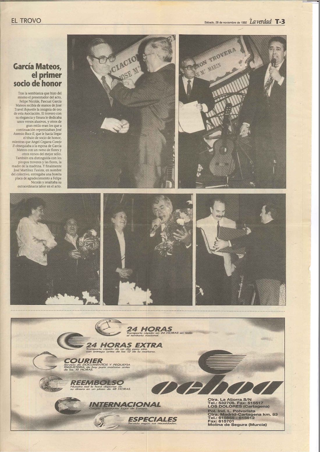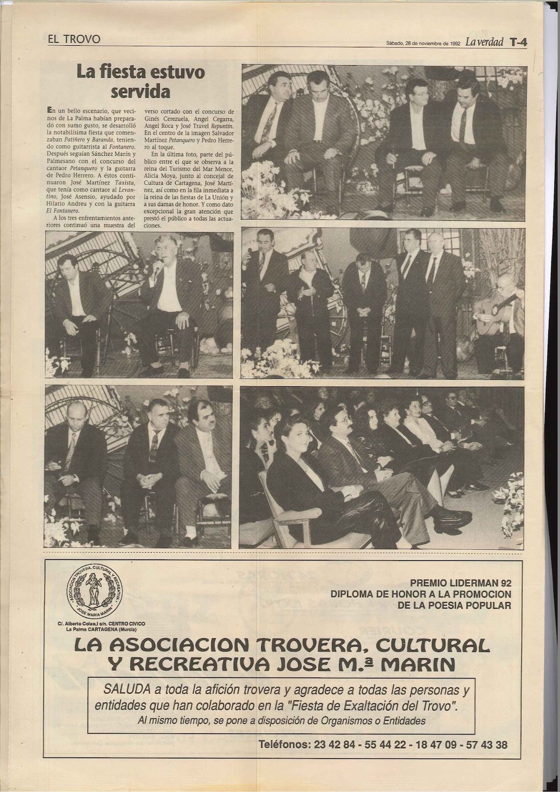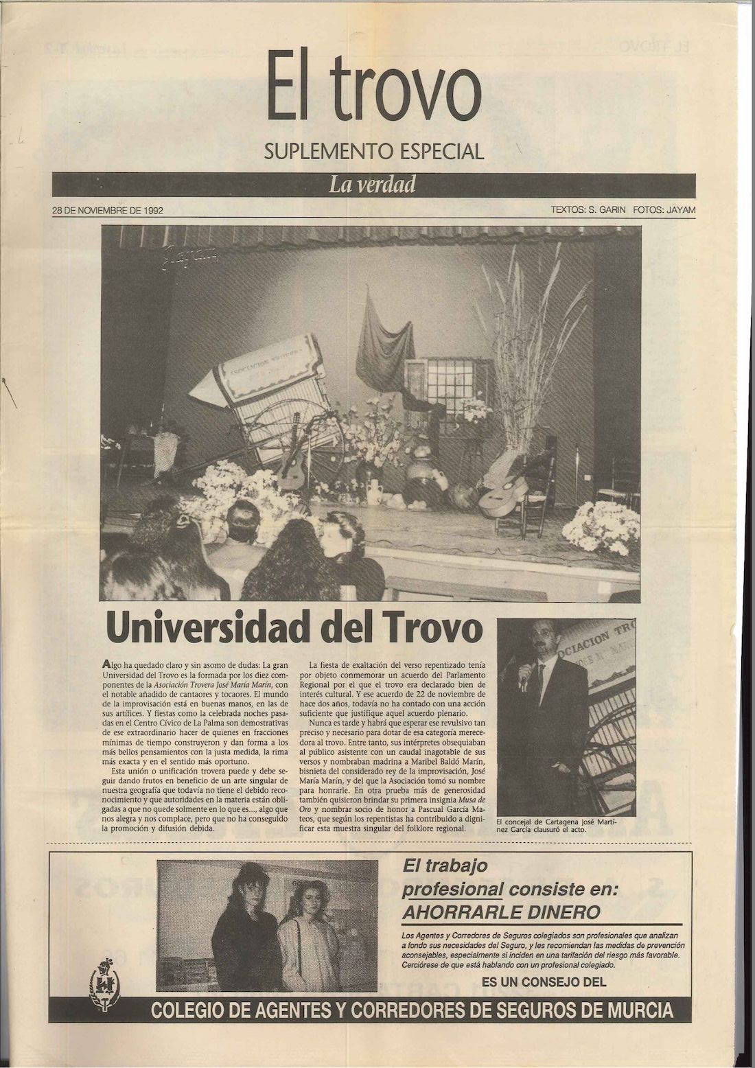 Publicamos el suplemento especial de cuatro páginas que el diario La Verdad publicó, con fotos de Jayam, en noviembre de 1992 sobre la fiesta de exaltación del verso repentizado que organizó la Asociación Trovera José María Marín, que en esta gala nombrada como su primer socio de honor al informador y agitador cultural unionense "por contribuir a dignificar el trovo en el folklore regional", siendo el 'Repuntín' quien le impuso la insignia de oro.
