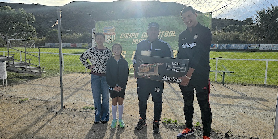 Las jóvenes Carmen y Lucía han sido las ganadoras de lote navideño rifado por el equipo de fútbol AD Las Palmeras de Portmán. En la foto posan con el presidente y con el entrenador de porteros.