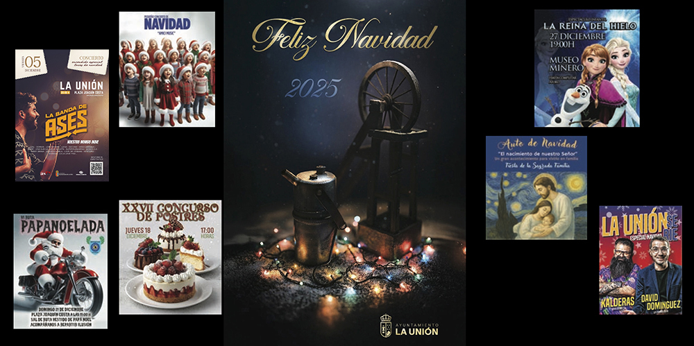 El Ayuntamiento de La Unión da a conocer el programa de actividades, que arranca este viernes con el encendido y la inauguración del Belén y que culminará el 6 de enero. Entre otras propuestas, hay música en directo ('Banda de ases', 'Amici Music', 'Concierto de Navidad', 'El camarote de los Hermanos Marx', 'Mujeres con alma' ), papanoelada motera, concurso de postres, exposiciones, carrera de cintas, doble monólogo, cine, musical infantil, preuvas, cabalgata de Reyes Magos, tren minero y actos religiosos.