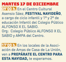 A las nueve comienza en el centro cultural Asensio Sáez el festival de Navidad de los ciclos de infantil del colegio Alfonso X El Sabio y a las 17 horas las amas de casa celebran la actividad ‘Prepárate el centro para esta Navidad’.