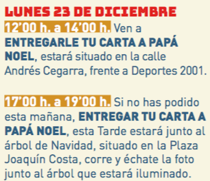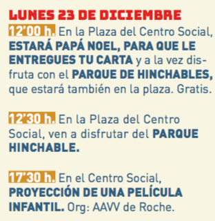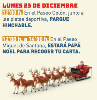 Papá Noel recoge cartas. En La Unión lo hará frente al establecimiento de 2001 Sport por la mañana en la plaza Joaquín Costa por la tarde. En Portmán estará en el paseo Miguel de Santana en una mañana que también tiene hinchables. Lo mismo sucede en Roche, donde también se proyectará una película.
