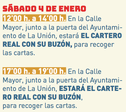 El protagonismo en la jornada de hoy en La Unión, Portmán y Roche es para los pajes reales y la recogida de las cartas dirigidas a los Magos de Oriente.