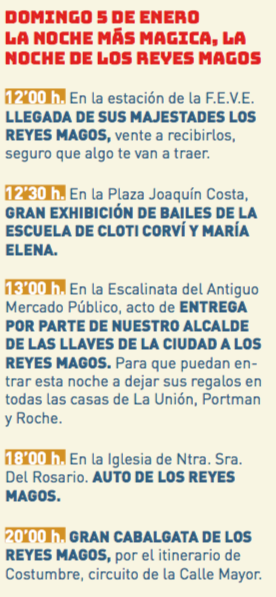 Sus Majestades llegan hoy a La Unión, donde recibirán las llaves de la ciudad por la mañana y protagonizarán por la tarde el auto de Reyes Magos y la gran cabalgata. Otro aliciente de esta jornda es la exhibición de bailes en la plaza Joaquín Costa. Melchor, Gaspar y Baltasar también estarán esta tarde en Portmán y mañana lo harán en Roche.