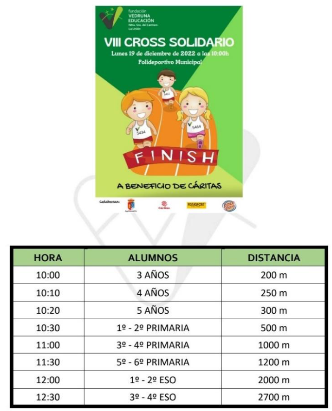 El lunes, 19 de diciembre, a partir de las diez de la mañana, los alumnos participarán en el VIII Cross Solidario que el centro, antiguo “Asilo de Huérfanos de Mineros”, viene organizando y cuyo destino de la recaudación irá a ‘Cáritas Interparroquial -La Unión-‘ para paliar las necesidades de las familias afectadas por la situación económica. El cross se llevará a cabo en el polideportivo municipal de La Unión, según calendario que se adjunta.