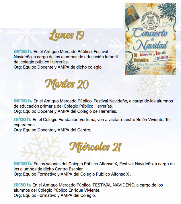 El Mercado Público acoge esta mañana el festival de los alumnos de educación infantil del colegio Herrerías, que tendrá un segundo capítulo el martes. Carmelitas también centra sus principales actividades prenavideñas en ambos días.