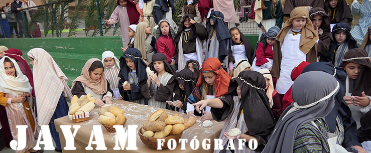 Todos los escolares de Carmelitas escenificaron en los patios y pistas polideportivas el mercado de frutas, telas y otros prodcutos, la carpintería, la zona de pescadores, los pastores, hebreos haciendo pan, costureras, los Reyes magos, alfareros, lavanderas en el río y, entre otros escenarios, un monumental Egipto y un dsierto con las jaimas, finalizando don el romano rey Herodes y su majestuoso hareén de jóvenes egipcias.