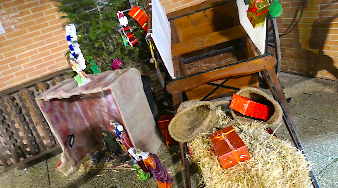 Nacimiento montado en la plaza del centro cívico de Roche, que incluye un carro, un trillo y un fardo de paja como símbolos de la faceta agrícola de esta tierra.