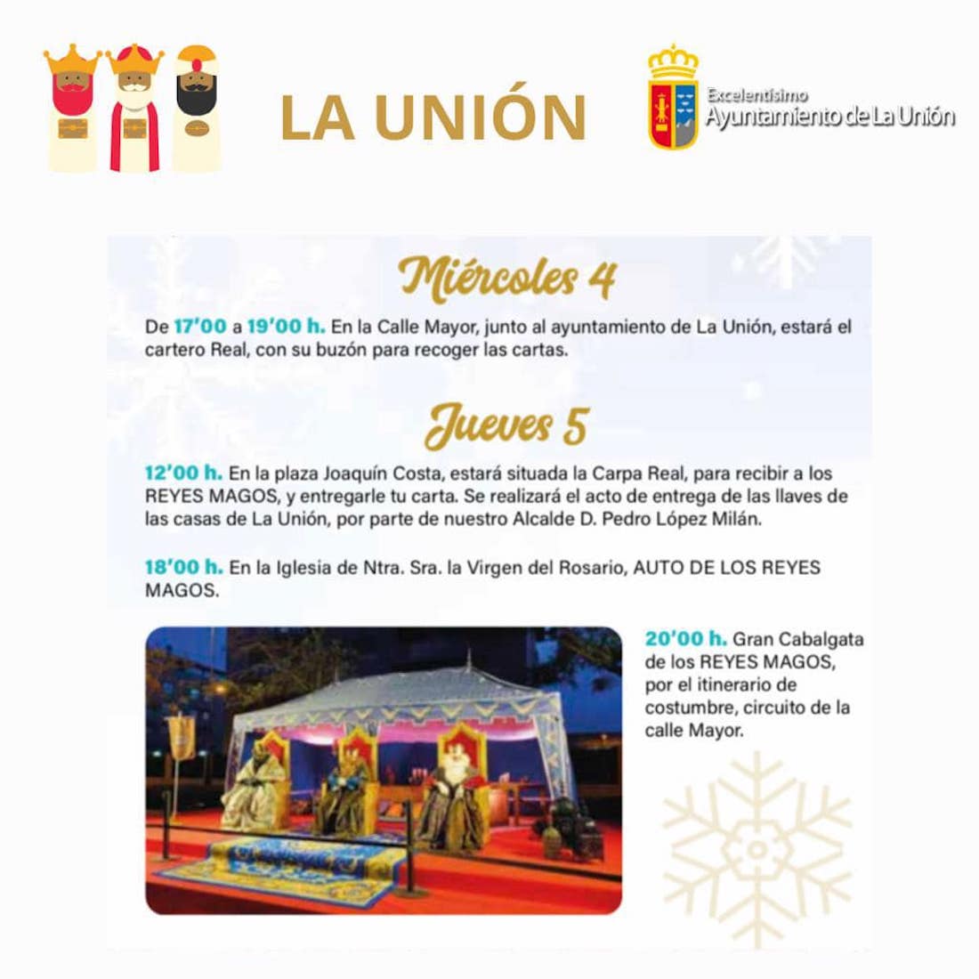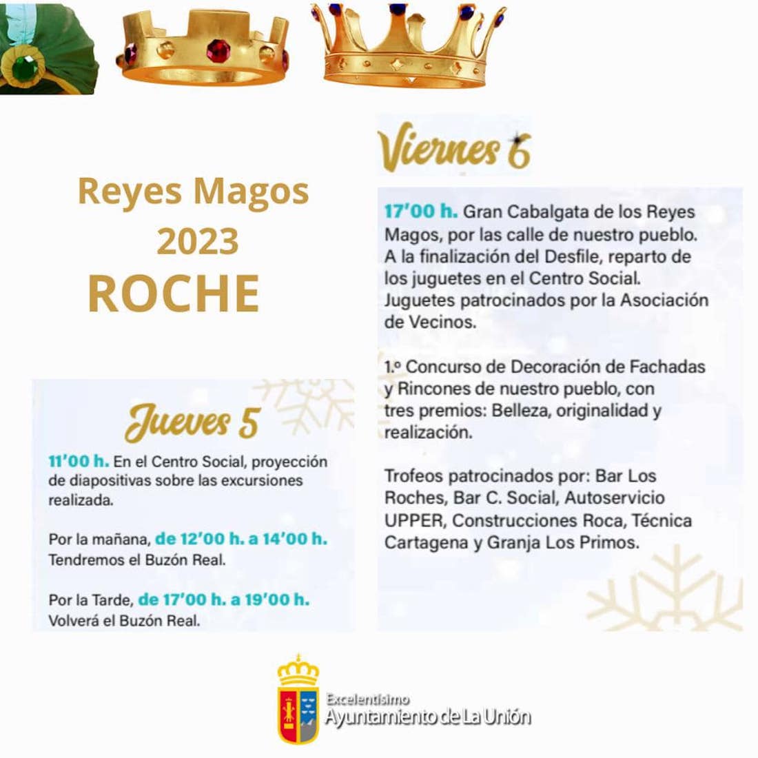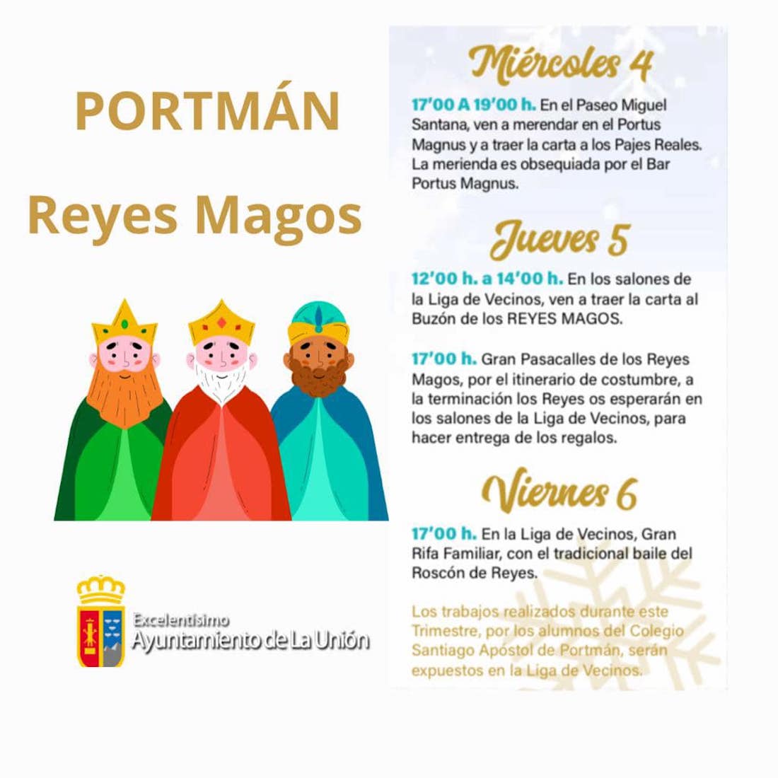 La Unión, Portmán y Roche se preparan para recibir a Melchor, Gaspar y Baltasar. Mañana estará el cartero real en la costa y en la ciudad, cuyas llaves recibirán el jueves los Magos de Oriente. Por la tarde, cabalgata por la calle Mayor y auto en la iglesia. En el pueblo portmanero el pasacalles será ese mismo día y al día siguiente recorrerán las calles rocheras.