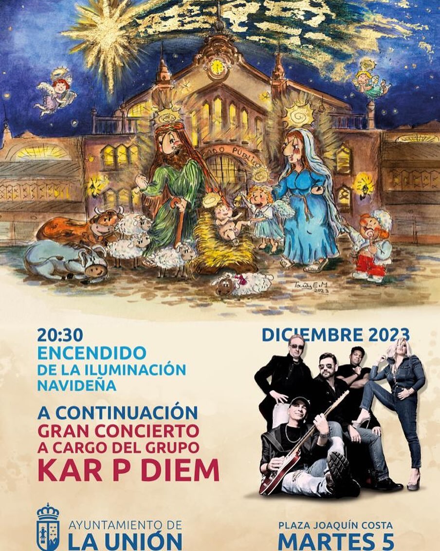 El Ayuntamiento de LaUnión anuncia que será a las ocho y media de esta noche cuando tenga lugar el tradicional encendido en la plaza de Joaquín Costa, donde habrá un concierto a cargo del grupo Kar-P-Diem, con música ochentera.