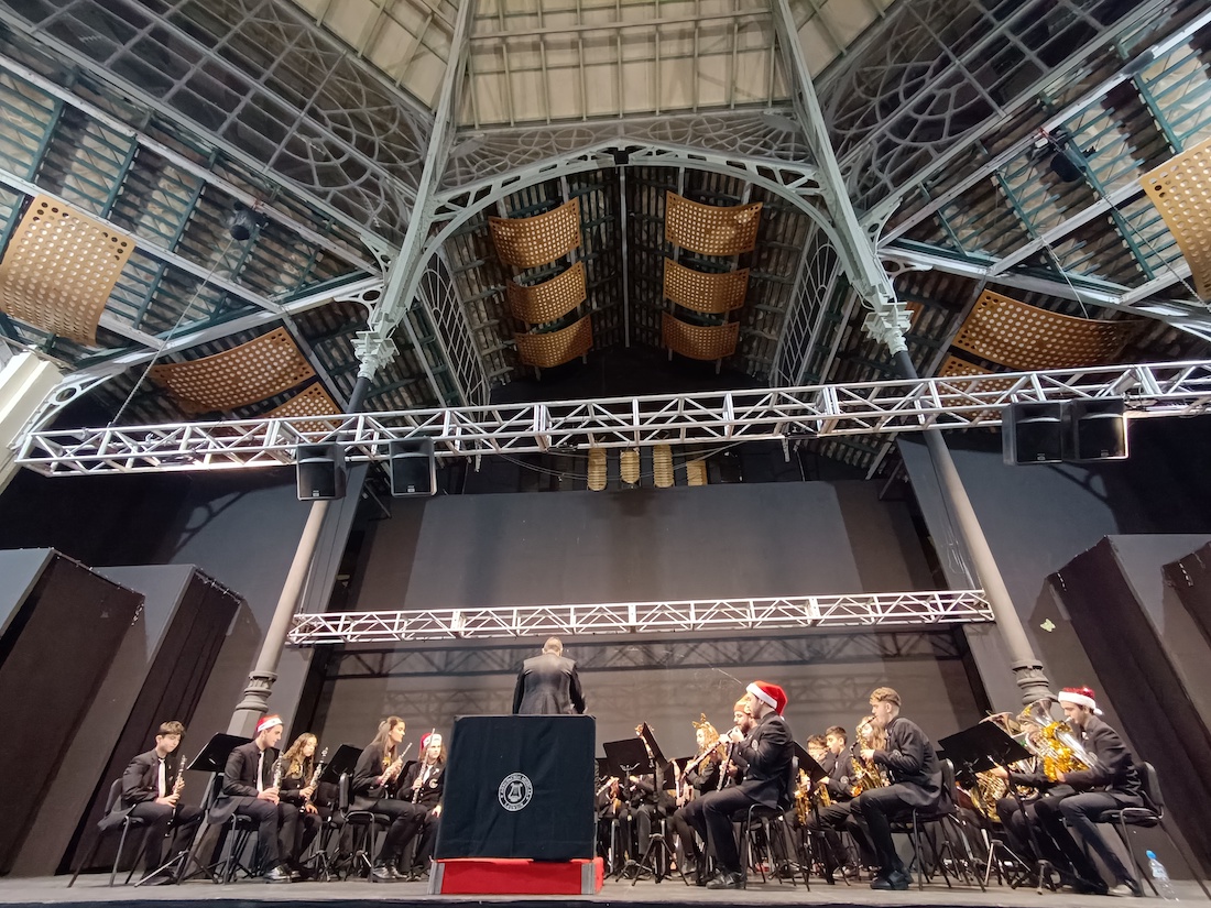 La primera parte de la velada fue para la banda escuela, bajo la dirección de Adrián Navarro García, siendo los temas ofrecidos 'Somewere out there' (tema principal de la película de animación 'Un cuento americano'), 'Two Spirituals” (obra de Michael Gree? y la inmortal 'Noche de paz'.