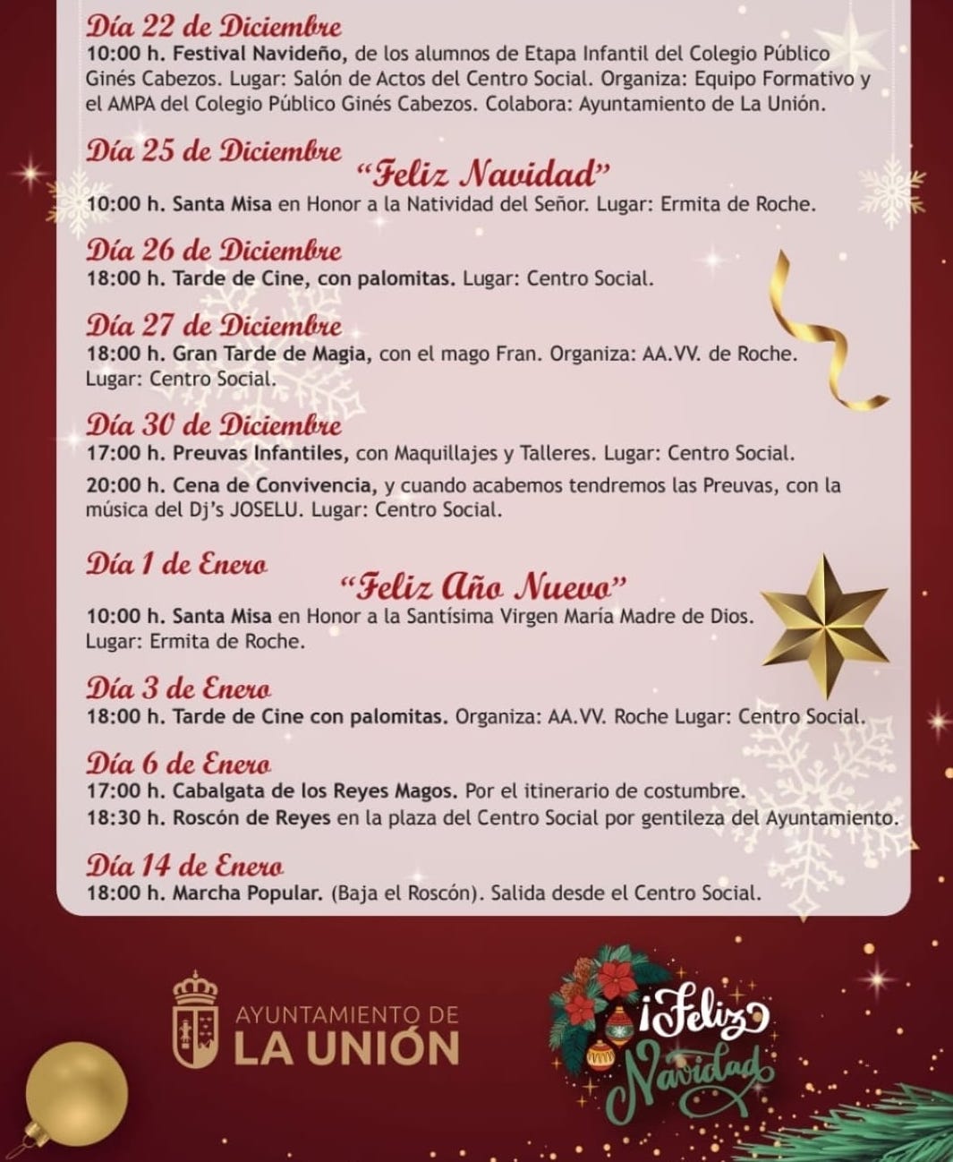 Con el festival que esta mañana (10 horas) llevarán a cabo en el centro social los alumnos del colegio Ginés Cabezos culminan las actividades previas al inicio de la Navidad en la pedanía unionense, para a partir del lunes, día de la misa de la ‘Natividad del Señor’, sucederse cine magia, preuvas, cena de convivencia, marcha popular y el día de Reyes Magos con cabalgata y roscón.