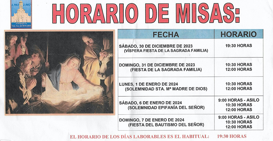 La parroquia de Nuestra Señora del Rosario de La Unión informa de los horarios de las eucaristías a celebrar en los dos últimos días de 2023 y en los primeros días del nuevo 2024.