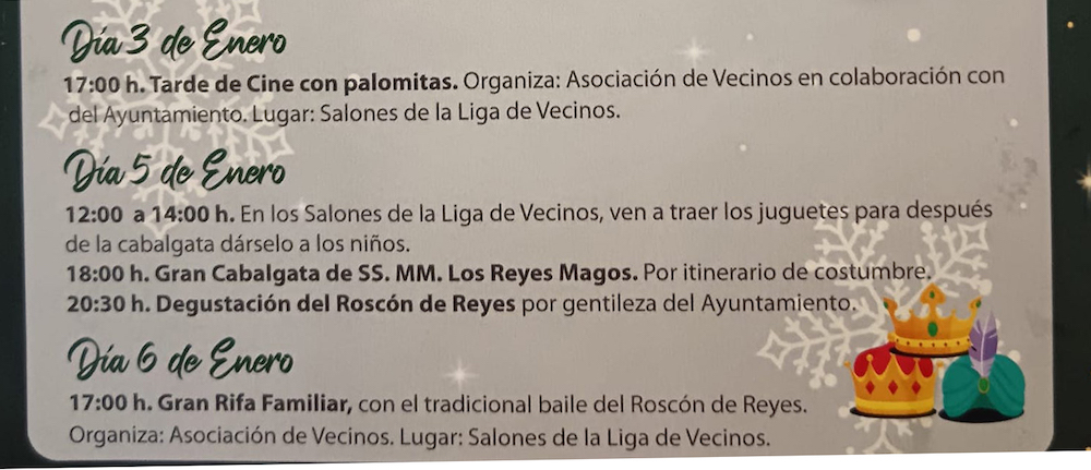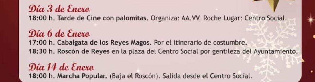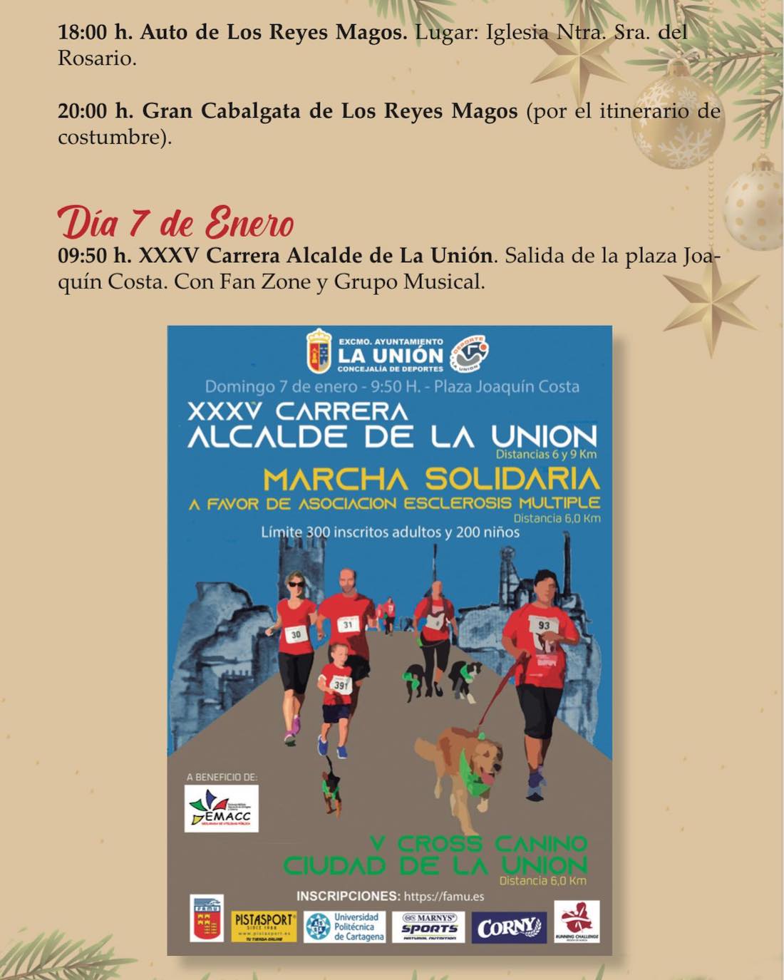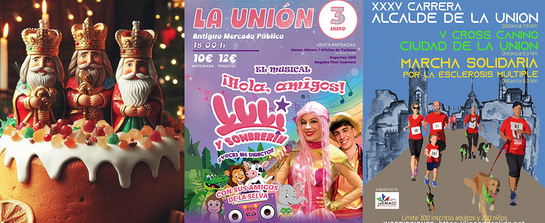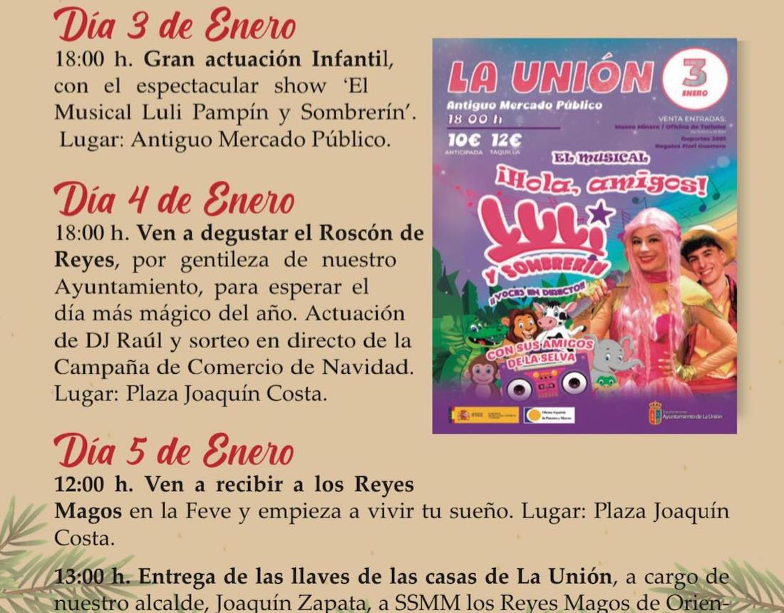 Melchor, Gaspar y Baltasar cruzarán La Unión, Roche y Portmán el próximo sábado en la jornada estelar de las propuestas de los próximos días, destacando también los roscones de reyes, el musical infantil del miércoles y la carrera 'Alcalde de La Unión', que estrena fecha de celebración.