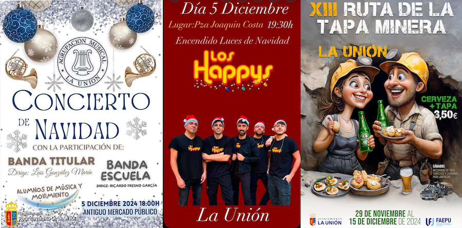 A partir de hoy ya es plena Navidad en La Unión, cuya ciudad celebra esta tarde el estreno del Belén que estrena ubicación en el bajo de la Casa del Piñón, para después tener lugar el concierto de la Agrupación Musical La Unión en el Mercado Antiguo, el encendido de la iluminación navideña urb ana y la actuación en la plaza de Joaquín Costa de 'Los Happys'. Además, la mayoría de locales hosteleros de la 'Rutapa minera' ofrecen hoy sus propuestas gastronómicas.