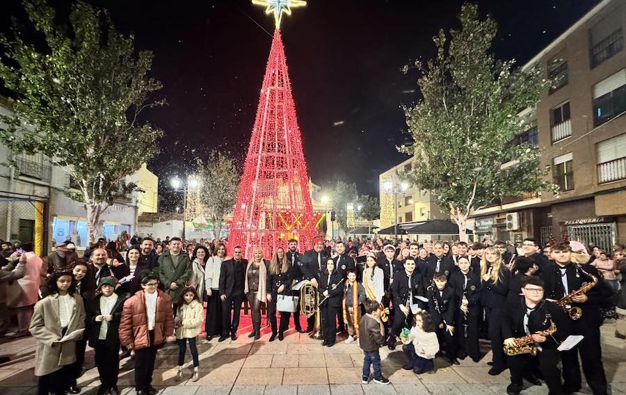 El símbolo navideño fue encendido en la tarde de ayer en la plaza de Joaquín Costa por una representación del gobierno local y de la corte de honor de la Fiestas del Rosario, envolviendo el momento los villancicos interpretados por Agrupación Musical La Unión.